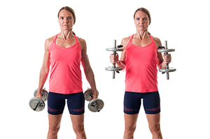 - Keeping the elbows in a fixed position, bend at the elbow so the lower arms lift up and toward the shoulders. Keep the shoulders relaxed as you work. Keep your grip firms and wrists in line with the forearm.