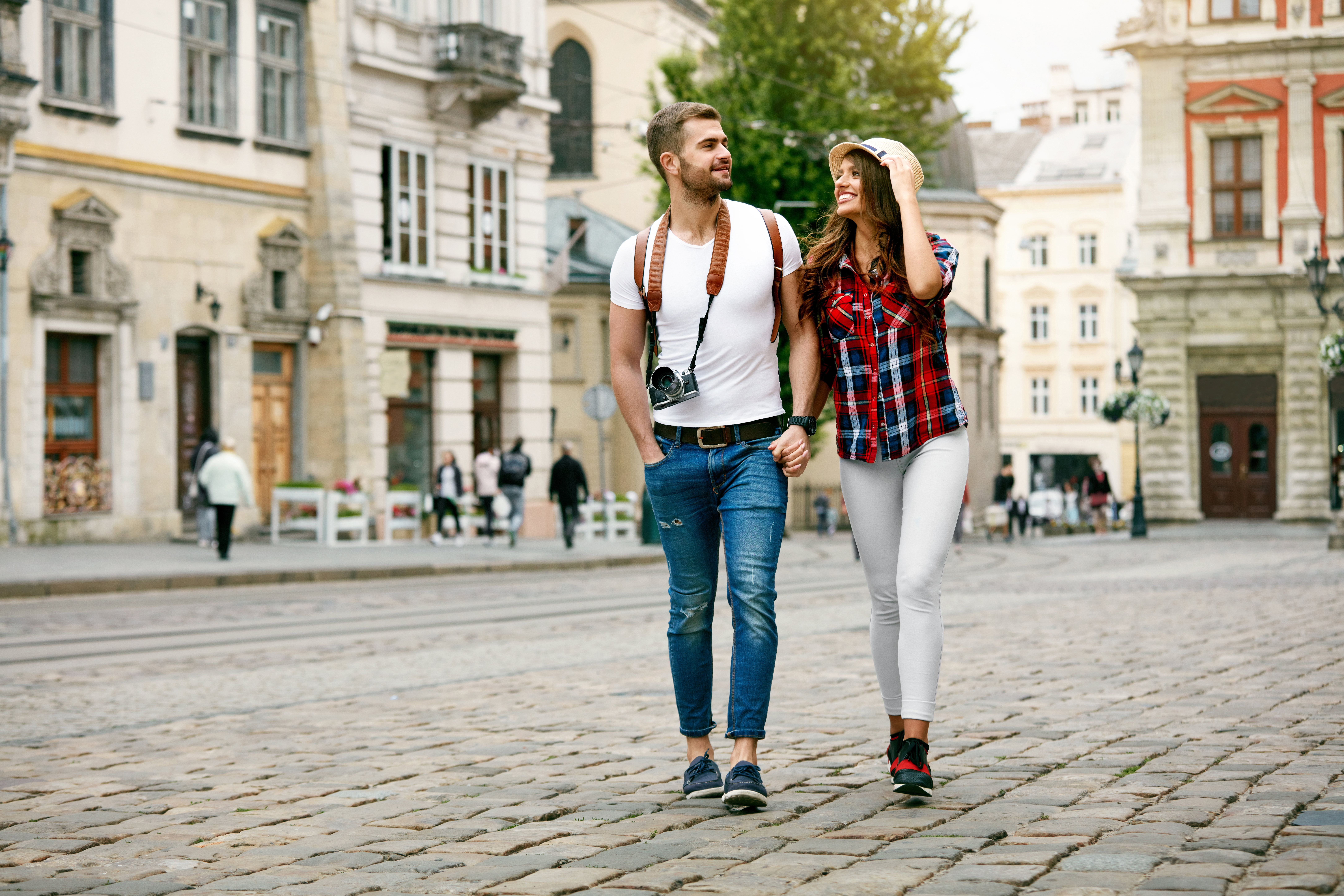 four friends laugh and walk together