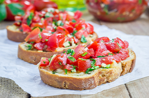 - Add a spoonful of the tomato mixture to each slice of toasted bread.