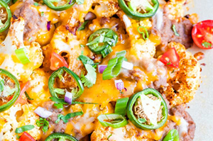 These low-carb cauliflower nachos are cheesy, delicious and loaded with extra veggies like tomatoes, jalapeño peppers, onions and avocado. They’re the perfect appetizer, but you can also serve them as a simple sheet pan meal.
